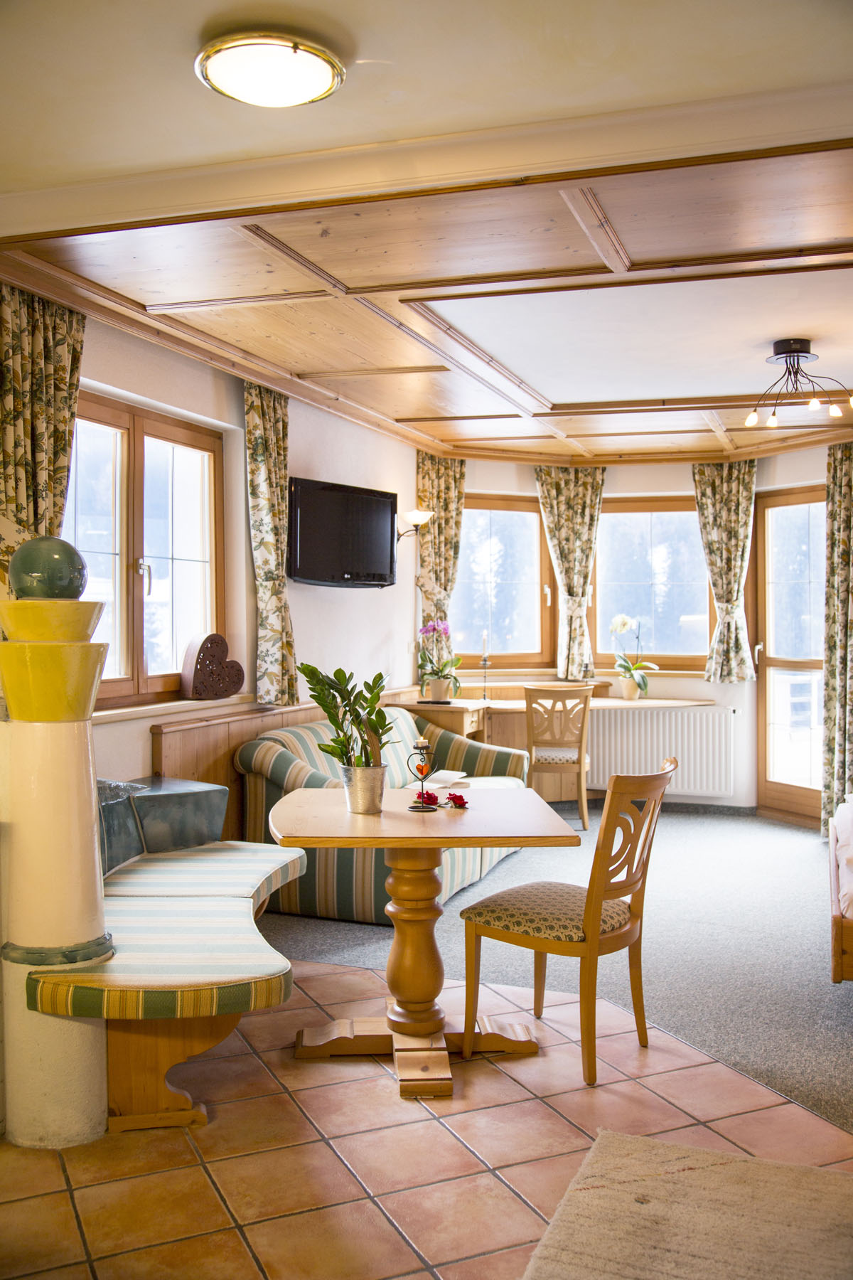 Die Studios und Apartments sind im klassischen alpenländisch-tiroler Stil eingerichtet und bieten eine behagliche Wohnatmosphäre. Jede Wohneinheit verfügt über eine eigene Küche oder Kochnische, einen gemütlichen Wohnbereich sowie einen elektrischen Kachelofen, der nach aktiven Tagen in den Bergen für wohlige Wärme sorgt.